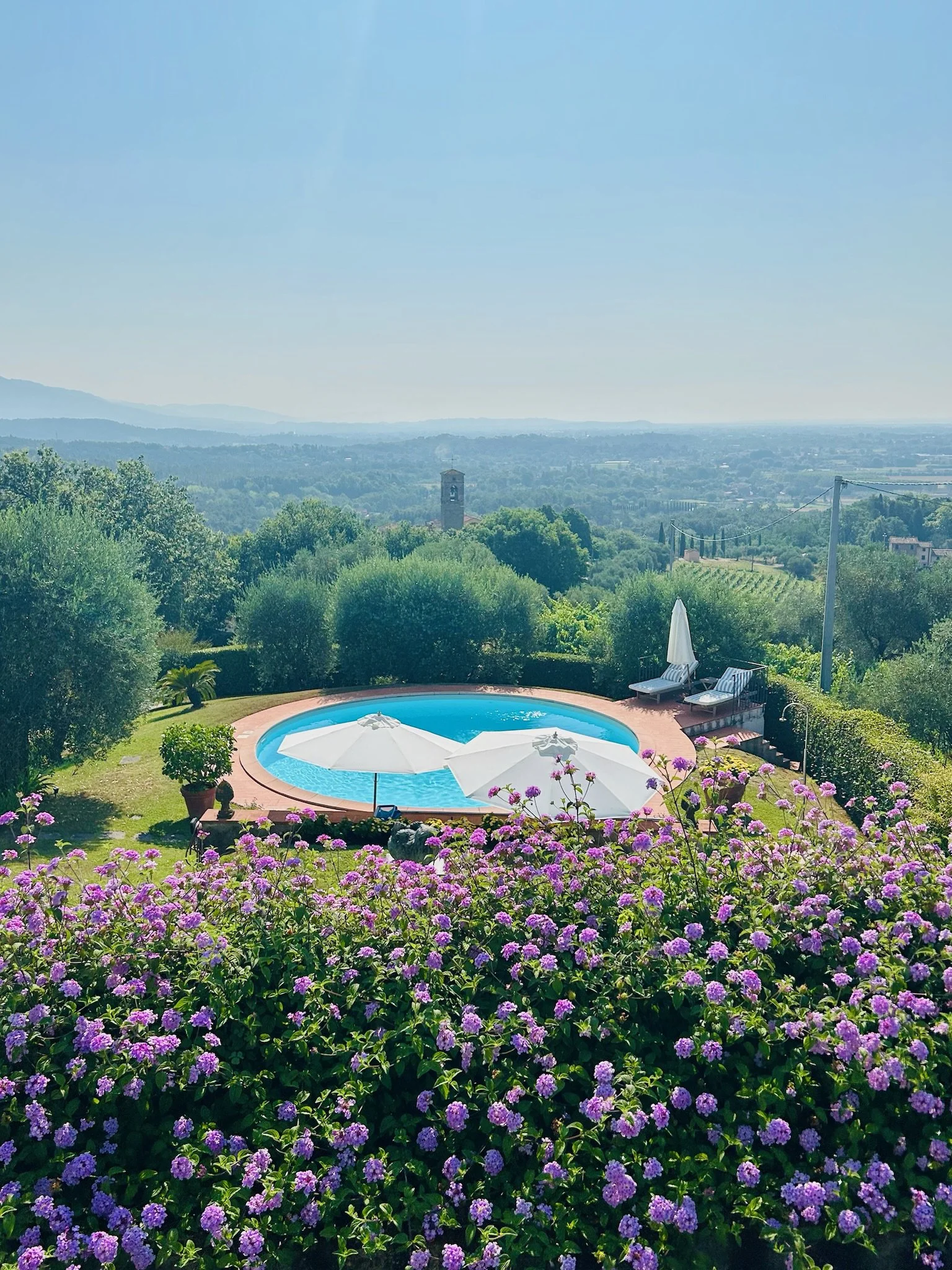 The pool offers relaxing loungers and umbrellas, with landscaping that frames the medieval church and valley below.